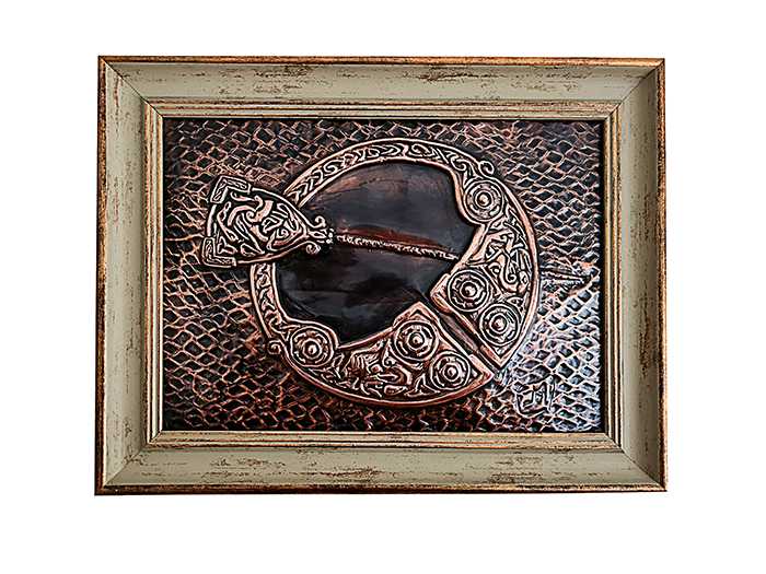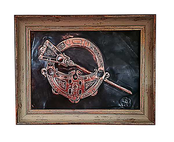 A beautiful repousse handcrafted copper art of the “The Celtic Brooch ” Have you ever wondered what inspired the design of famous works such as the Tara brooch? While the torc was probably the most honoured form of adornment amongst the Celts, the brooch was the most popular. This popularity is due to the fact that they were worn by both men and women and served the practical purpose of fastening cloaks and other clothing items. These brooches replaced straight pins to fasten clothing and were the early version of the safety pin we still use today. They were known as fibula brooches, possibly because their long shape resembled the shape of a fibula bone. It is thought early Mycenaean pins influenced the Celts; however, the Celts began to develop and explore this design creating their unique version. First, they made the brooch longer for practical and decorative purposes; now, the brooch could hold more fabric.