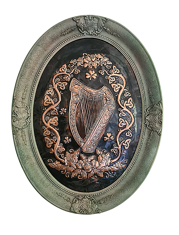 The Harp among Celtic knots wreath in a restored vintage frame.